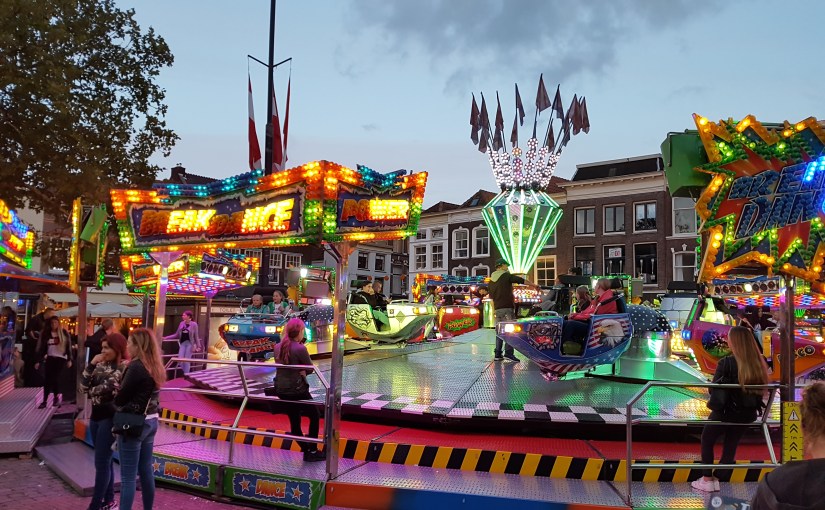 Het is weer kermis in Gouda. Op de Markt. In mijn voortuin. Gewoon te bekijken vanuit mijn huis. Nou ja, en natuurlijk ff buiten. Kijk dat hoge ding in het filmpje. Die 40 meter hoge draaimolen, daar ga ik misschien nog wel in deze week.