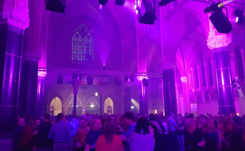 Eenmaal maak ik de fout om midden in de kerk te staan. Een dame probeert me tot dansen te bewegen. ,,Last van mijn knie’’, lieg ik, om de rest van de avond aan statafels aan de zijkant te vertoeven. Ook zo is het genieten van dit feest. Die plekken lenen zich goed om even bij te praten met collega’s in het vak die hier ook rondlopen.