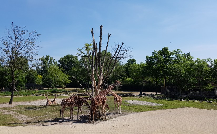 Genoten van koffie op het plein voor het (ook gesloten) Vrije Vlucht gebied, en de rust op een bankje bij de grote vijver. Net zo heerlijk is het kijken naar de etende en van de rust en de zon genieten giraffes. Geen Dikkertje Dap te bekennen.