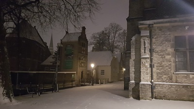 Gelukkig is het vrijwel onophoudelijk blijven sneeuwen – niet van die dikke vlokken, maar stuifsneeuw – waardoor de Markt toch al snel weer helemaal wit kleurt.