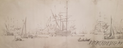 Schilders uit de zeventiende eeuw. Van de Velde de Oude legde grote zeeslagen van de Hollandse vloot tegen de Engelsen vast. De Admiraliteit zorgde voor zeilscheepje, van waaruit hij de gevechtshandelingen van dichtbij kon bestuderen.