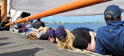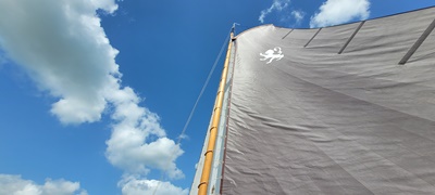 Tijdens het zeilen steeds vanaf het dek kunnen opkijken naar het grote zeil dat een afmeting heeft van 110 vierkanter meter, met de Leeuwarder leeuw fier bovenin! En natuurlijk van al het fraaie houtwerk aan boord. Een genot om te zien. Het is een eind rijden van Gouda naar Grou, maar dan heb je ook wat.
