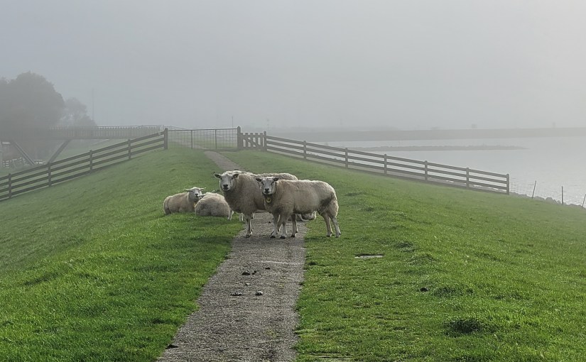 Ook maar wat foto’s gemaakt en op Facebook geplaatst. Als ik thuis op de pc de foto’s nog eens goed bekijk, valt me er eentje op: schapen op de dijk in de mist. De foto die je boven dit verhaal ziet. Een gelukje.