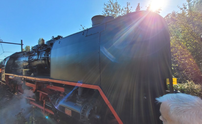 In de stralende zaterdagzon is het genieten van de stoere grootte van de locomotieven, de stoom die uit de ketels omhoog cirkelt. En van de nostalgische gevoelens die van de gezichten van de andere bezoekers is af te lezen.