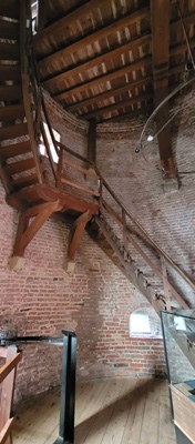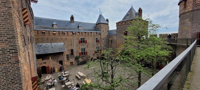 Twee routes voeren je door de verschillende delen van het kasteel. Ondanks de meivakantie zijn er geen files op de smalle wenteltrappen in de toren. Doorschietgaten van de verdedigingsmuren heb je een prachtig uitzicht op de omgeving, ja ook op de moderne windturbines.
