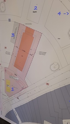 Legenda bij de tekening hierboven: oranje vlak is het stadhuis. 1: de ‘ster’, waar de kerstboom altijd staat. 2: 2 jaar lang de alternatieve plek voor de boom. 3: het oorlogsmonument. 4: is eigenlijk net buiten de tekening en geeft de locatie van mijn appartement weer.