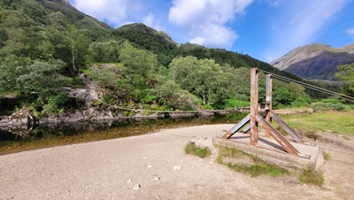 Uiteraard eerst weer genoten van de aankomst in het dal, dan luisteren naar de wind en het water; de zon die glinstert over het water van toch min of meer het begin van de River Nevis. Na een half uur genoten te hebben van het uitzicht bij de staaldraadbrug en de paar mensen die er zijn die de oversteek over het water via die drie-draden-brug maken, loop ik verder het dal in.