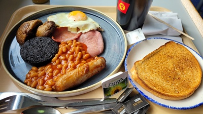 Engels ontbijt Volgende dag naar Uig aan de andere kant van Skye voor de overtocht naar Harris en Lewis. Op camping niet ontbeten, want aan boord van de veerboot is een echt Engels ontbijt verkrijgbaar.