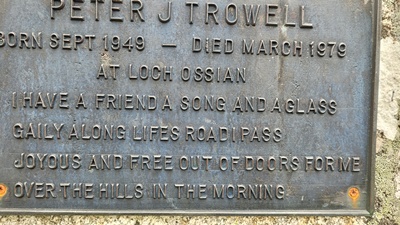 De laatste standplaats dit jaar is Kinlochleven bij Rannoch Moor/Glencoe. Weer de jaarlijkse wandeling naar Peters Rock op Rannoch Moor. Het rotsblokje is vernoemd naar Peter J Trowell die hier vlakbij bijna een halve eeuw geleden in de winter verdronk in Loch Ossian. De naam Peters Rock verwijst naar een plaquette op de rots met daarop zijn naam en een gedichtje dat al een paar decennia inmiddels mijn levensmotto is: