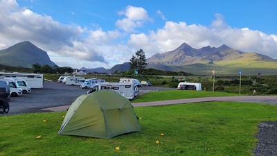 Tegen drie uur terug op de camping. Borrel, Polarsteps bijwerken en alvast uit de tent halen wat vannacht niet echt noodzakelijk is. Morgenochtend tegen half vijf tent inpakken. Wil uiterlijk een uur later hier wegrijden om op tijd te zijn voor het inchecken voor de veerboot van Tarbert naar Uig op Skye. Vandaar gaat het via Inverness (boodschappen, tanken) naar Cannich in Glen Affric.