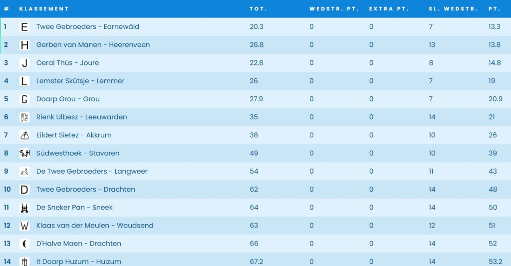 Het klassement tot en met maandag staat hieronder. Ljouwert zesde dus. Skûtsjesilen 2025 gaat door tot en met vrijdag. Dan is de laatste wedstrijd op het Sneekermeer bij Sneek. En daaronder filmpje van de wedstrijd op het Sneekermeer bij Terherne. En daaronder filmpje met fotocollage Workum en een met Stavoren.